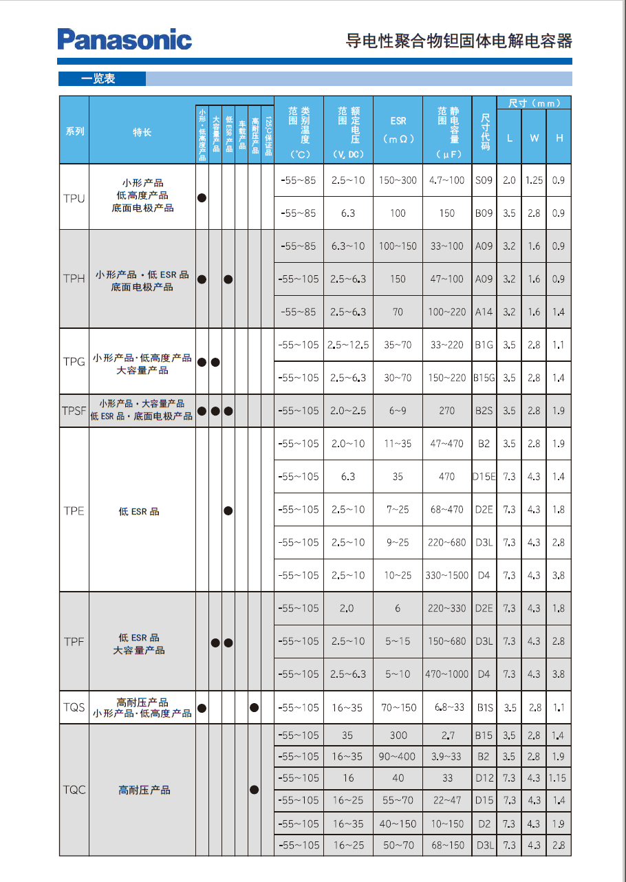 Panasonic through the use of conductive polymer materials, conductive polymer capacitor to achieve low ESR characteristics. Its great value, the characteristics of low ESR, the most fit to get rid of the noise in the wide domain, also has given it a stable temperature characteristics.
